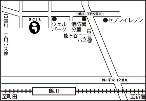 ※ バス停からあとりえ・うへの道のりは、能ヶ谷二丁目バス停からは上り坂、鶴川一丁目バス停からは下り坂となります。